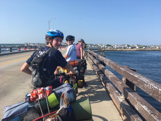 We may be a small group of five, but we sure do know how to have a good time! Today we drove past some beautiful New Hampshire homes on our way north to Hampton. Many locals stopped us to ask about our journey while we coasted through the East Coast Greenway Trail and made our way to 1A coastal road. They gave us tips for the road ahead, creating even more reason to be excited for budding adventures! The absolute best part of the day- we unanimously voted- was when we dismounted our bikes and went running straight into the ocean. It was cold, refreshing and the waves left us splashing around like a bunch of beach bums. After some water frisbee and a game of tag, we hit the road to collect our dinner ingredients at a local grocer before arriving at the forested nook we lay our hammocks and tents for the night, Tidewater Campground. The girls made Ramona pasta shells with broccoli while the rest set up camp, made a fire and watched the sun drift beneath the horizon. We all have high hopes for the ventures ahead of us tomorrow!